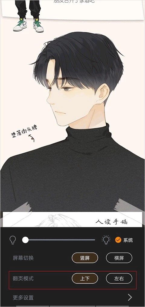 2、在漫画界面点击,同样会显示设置。在设置里,你能够切换翻页方式,挑选自己习惯的方式就行。