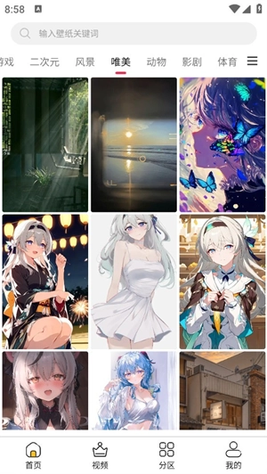 2、“视频”板块对动态壁纸加以归类,涵盖风景、二次元以及动漫等各类。