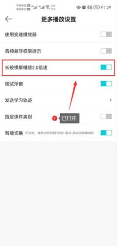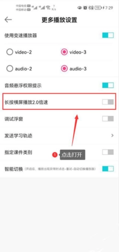 3、接着,点击开启长按横屏播放2.0倍速的功能开关。