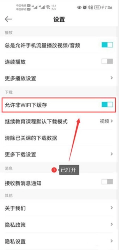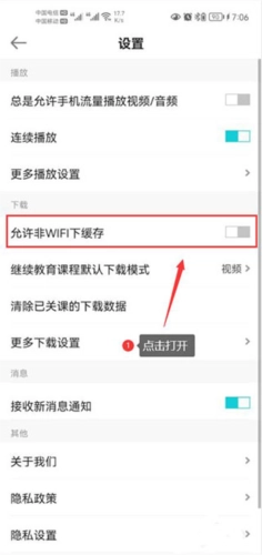 2、点击打开允许非WIFI下缓存功能开关(图片中圈红的部分)