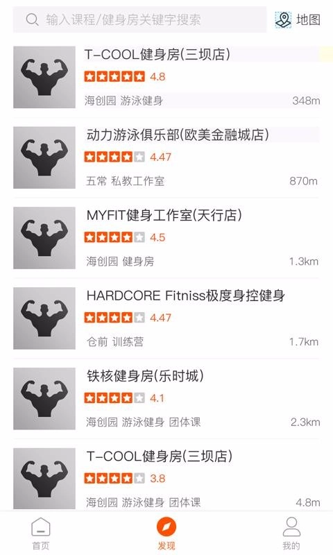 6、点开发现模块,查找周边众多健身会所的相关信息。