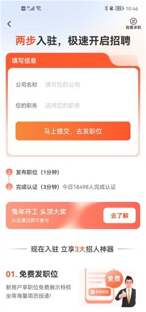 跳转至新页面后,填写公司名称以及您的职位,点击页面中的【马上提交,去发职位】按钮。