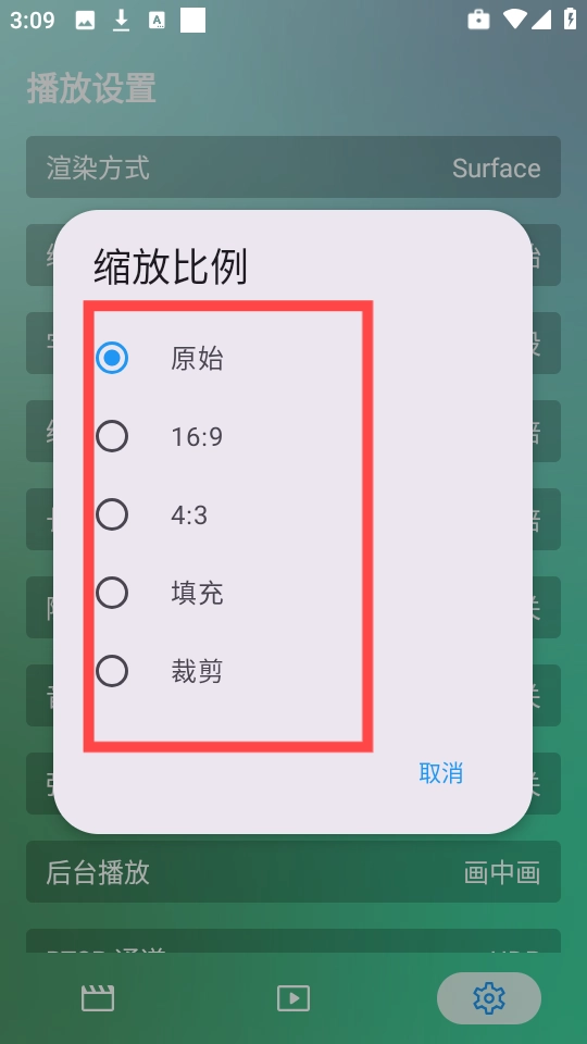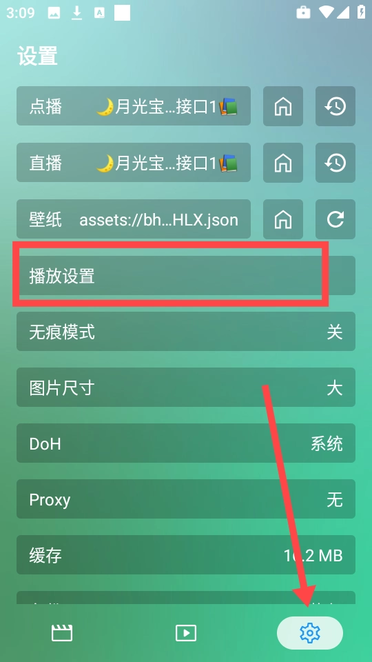 1. 打开软件后,轻点右下角的设置按键,查找“播放设置”。