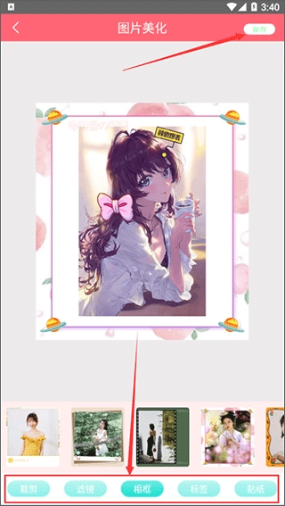 3、在页面底部,你能够挑选裁剪、滤镜、相框、标签等功能来美化照片,待自己感到满意后,点击右上角的保存按钮就行。