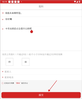 2. 当进入界面,依次输入标题、内容并上传图片,接着输入联系人及电话,完成这些操作后点击提交就行。