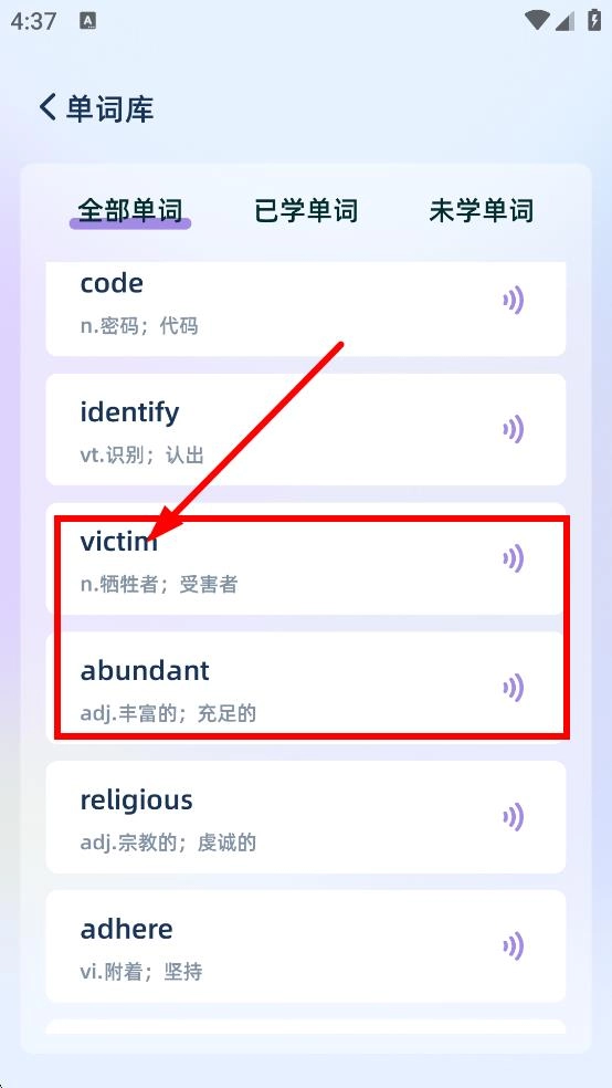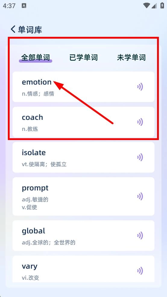 在单词库的全部单词列表里,你可以查看各个单词,并且能够点击对应的按钮来听取它们的发音。