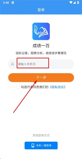 在手机登录界面输入手机号并勾选相关协议后,点击“下一步”按钮。