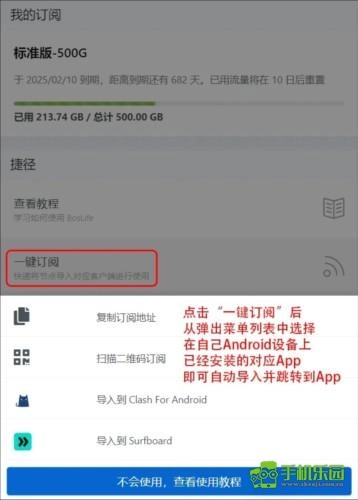 使用已安装客户端的安卓本设备浏览器登录个人中心,在仪表盘页面下方的捷径区域找到“一键订阅”按钮,点击后选择“导入到”选项,系统会自动提示跳转到客户端。