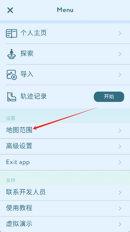 首先要点击左上角的三条横线图标进入设置中心,然后选择“地图范围”选项。