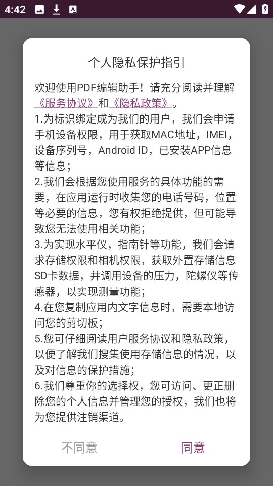 首先我们要安装好PDF编辑助手,接着打开该软件并同意各项使用权限。