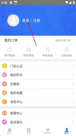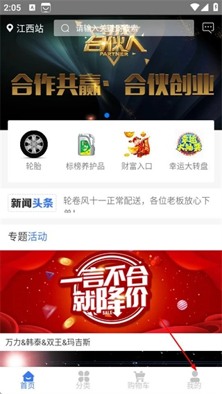在轮卷风汽配的首页,点击右下角的“我的”选项,即可进入个人页面。