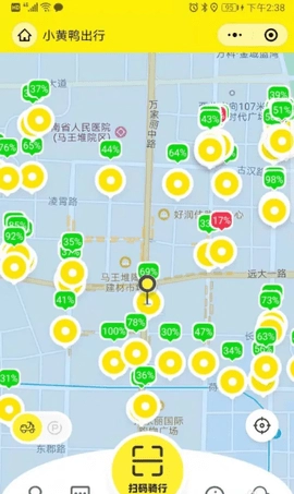 当您授权应用获取定位权限后,就能查看周边的可用车辆。点击车辆即可完成预约,预约期间其他用户无法使用该车辆。车辆显示的绿色百分比代表剩余电量,红色标识则表示车辆电量处于不足状态。