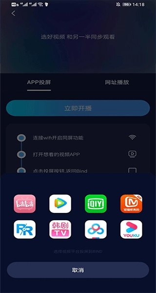 3、进入同屏看视频界面后,点击“立即开播”按钮,在弹出的选项列表里挑选播放器(以下操作以芒果TV为例);