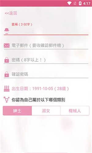 2、在注册页面填写名称、电子邮箱、密码、出生日期等信息,并选择自己拟注册的类别。