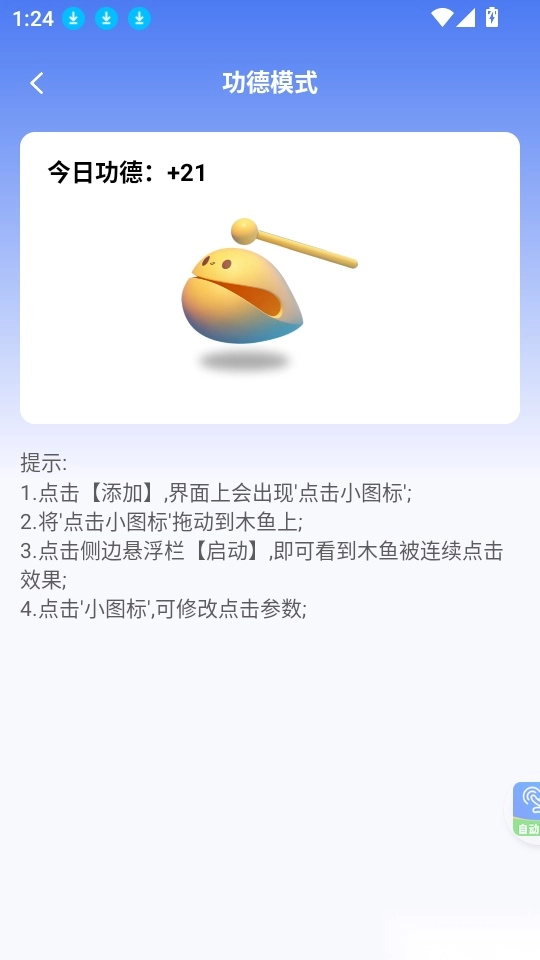 用户可以开启功德模式点击木鱼,通过敲击木鱼积攒功德,点击次数随心而定。