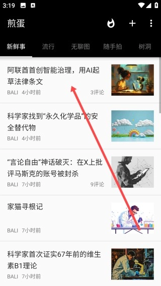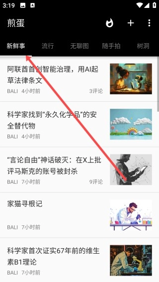 1、打开煎蛋,点击【新鲜事】