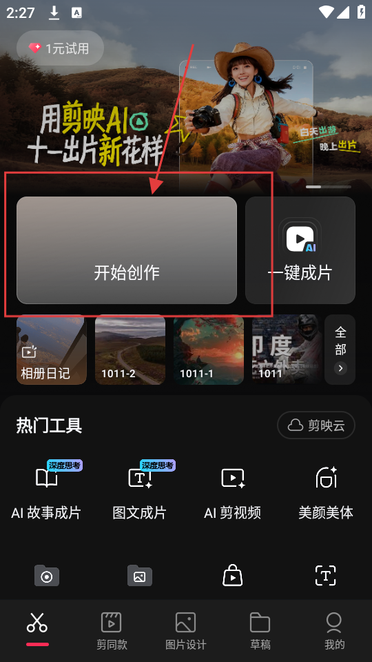 第一步,打开剪映,点击开始创作。