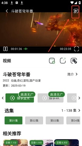 2.轻点播放界面,调出视频播放功能界面,点击右上角的投屏按钮,在设备列表里选择你想投放的电视就行。