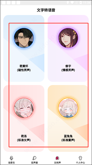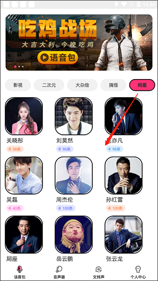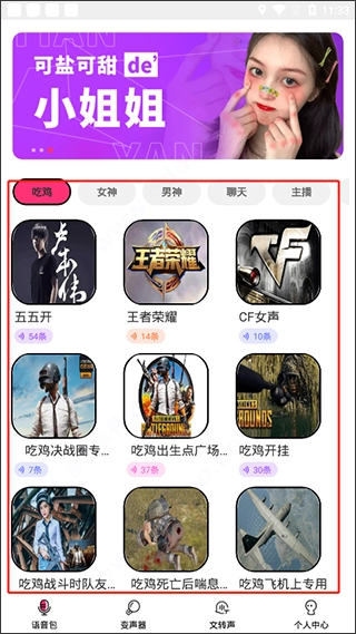 1、安装完成后,可直接在手机里启动吃鸡语音包变声器软件,进入软件就能看到大量语音包。