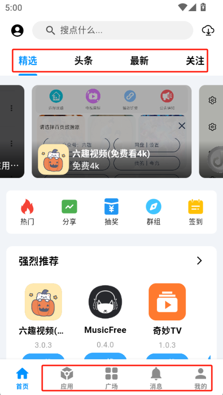 1. 进入cy社区后,顶部设有精选、头条、最新、关注几个板块,底部则有应用、广场、消息、我的功能入口,大家可根据自身需求点击相应选项。