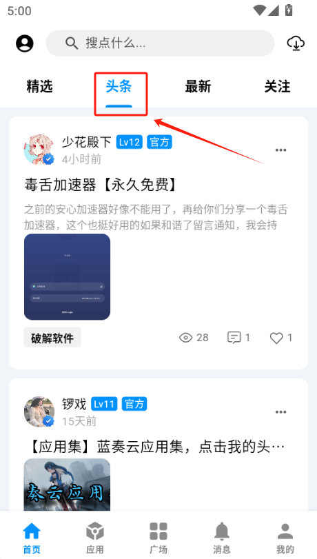 3. 头条由部分用户发布的帖子构成,你能在此查找相关教程以及应用的使用方法。