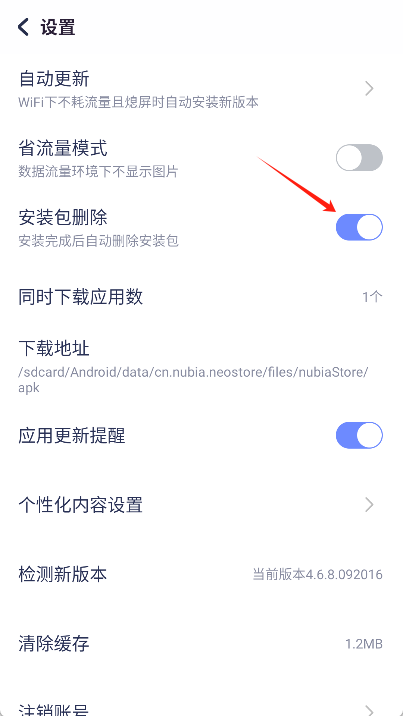 4、进入设置菜单后,找到“安装包删除”这一选项,然后打开它右侧的开关。