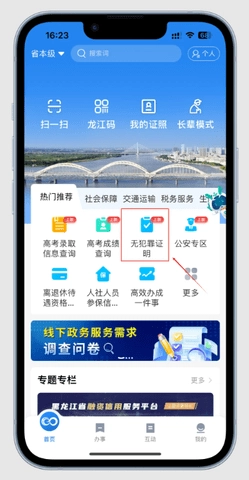 1、启动龙易办应用,在首页界面找到“无犯罪证明”功能入口,点击该入口进入对应页面。