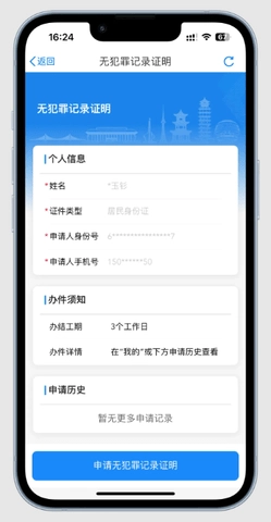 2、点击下方的“申请无犯罪记录证明”选项,接着完成人脸识别认证步骤。