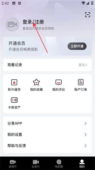 1、打开欢喜首映应用,进入首页后,点击底部导航栏中的“我的”选项,即可进入个人中心页面。