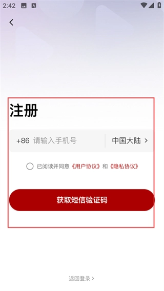 2、进入个人中心页面后,找到并点击登录注册选项,即可跳转至手机号登录页面。