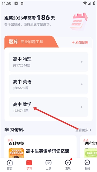 2、在【学习】页面的【题库】板块里,找到并点击【高中数学】选项,进入该学科的题库内容页面后,查看题目数量等相关信息。