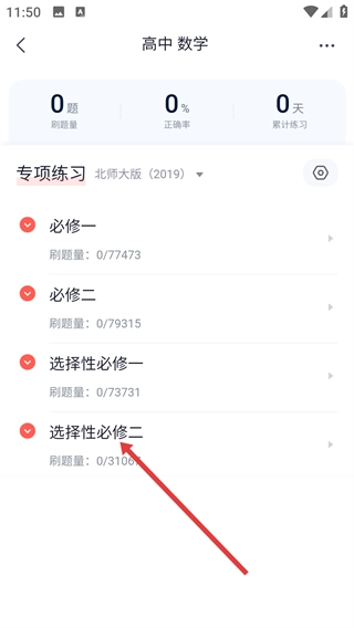 3、进入【高中数学】题库页面后,找到并点击【选择性必修二】专项练习选项,即可进入该模块对应的题目练习界面。