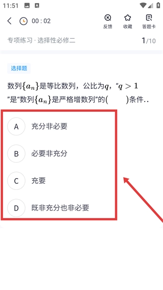 4、在专项练习界面解答题目时,这道等比数列题的答案是【D-既非充分也非必要】,原因在于q>1并不能推出数列严格递增,而数列严格递增也不一定需要q>1。