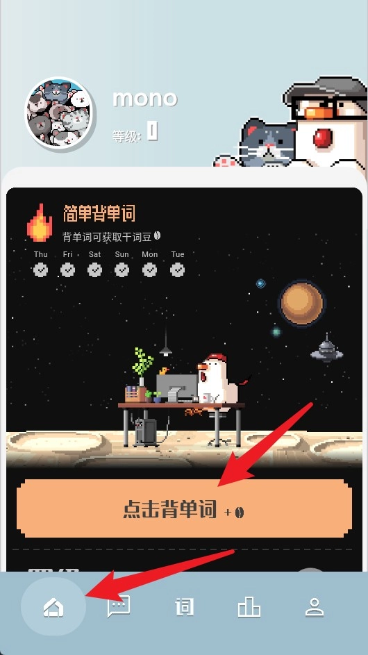 1、点击主页面的“点击背单词”按钮即可开启学习,进行背词操作能够获得干词豆奖励。