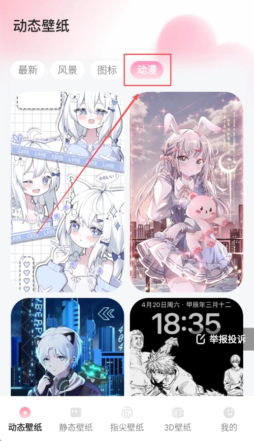 1、日常使用打开软件选择动态壁纸分类浏览资源,浏览动漫等主题壁纸资源选择喜欢的图片进行设置应用操作。