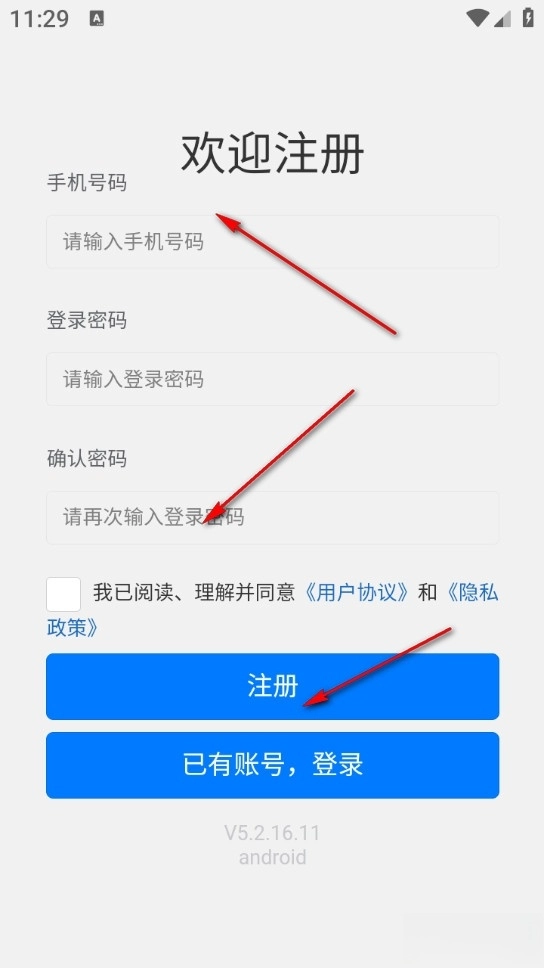 3、然后输入手机号、验证码、密码等信息点击注册即可