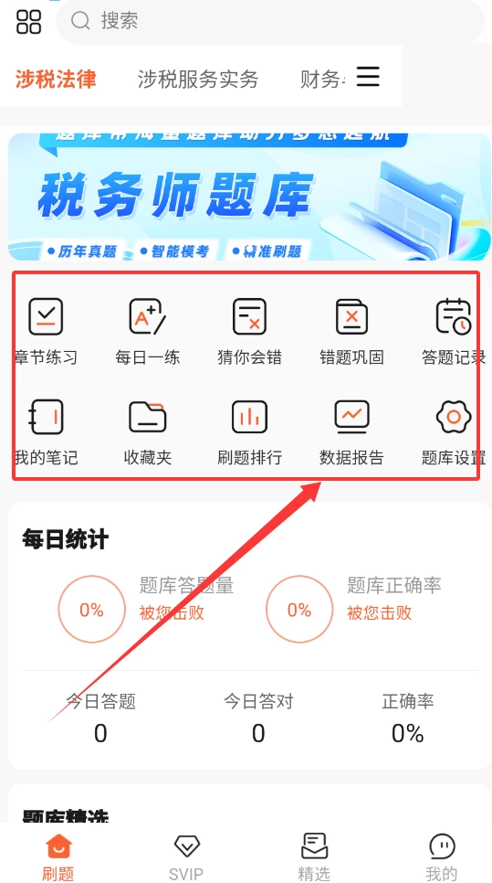 1、打开软件后先在主界面选科目呢,顶部搜索框能快速找题,下面有章节练习和每日一练等功能入口。