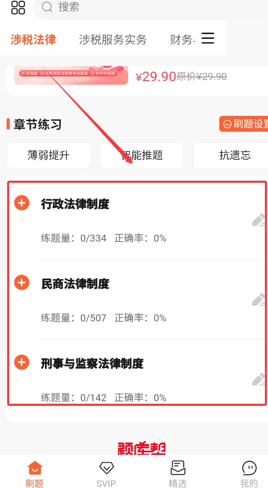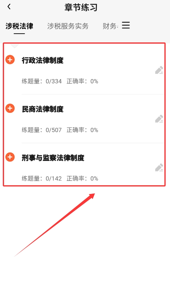 2、进入章节练习会看到行政法民法等分类,每个类别都标着练题量和正确率方便你了解进度。