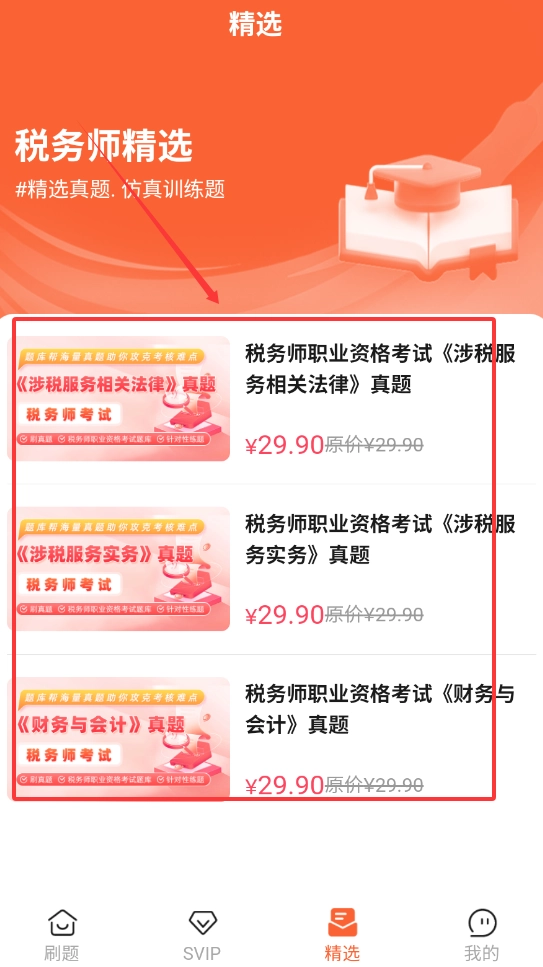 4、想买真题的话点底部精选页,那里有各科真题商品列表,价格和科目信息都展示得很清楚。
