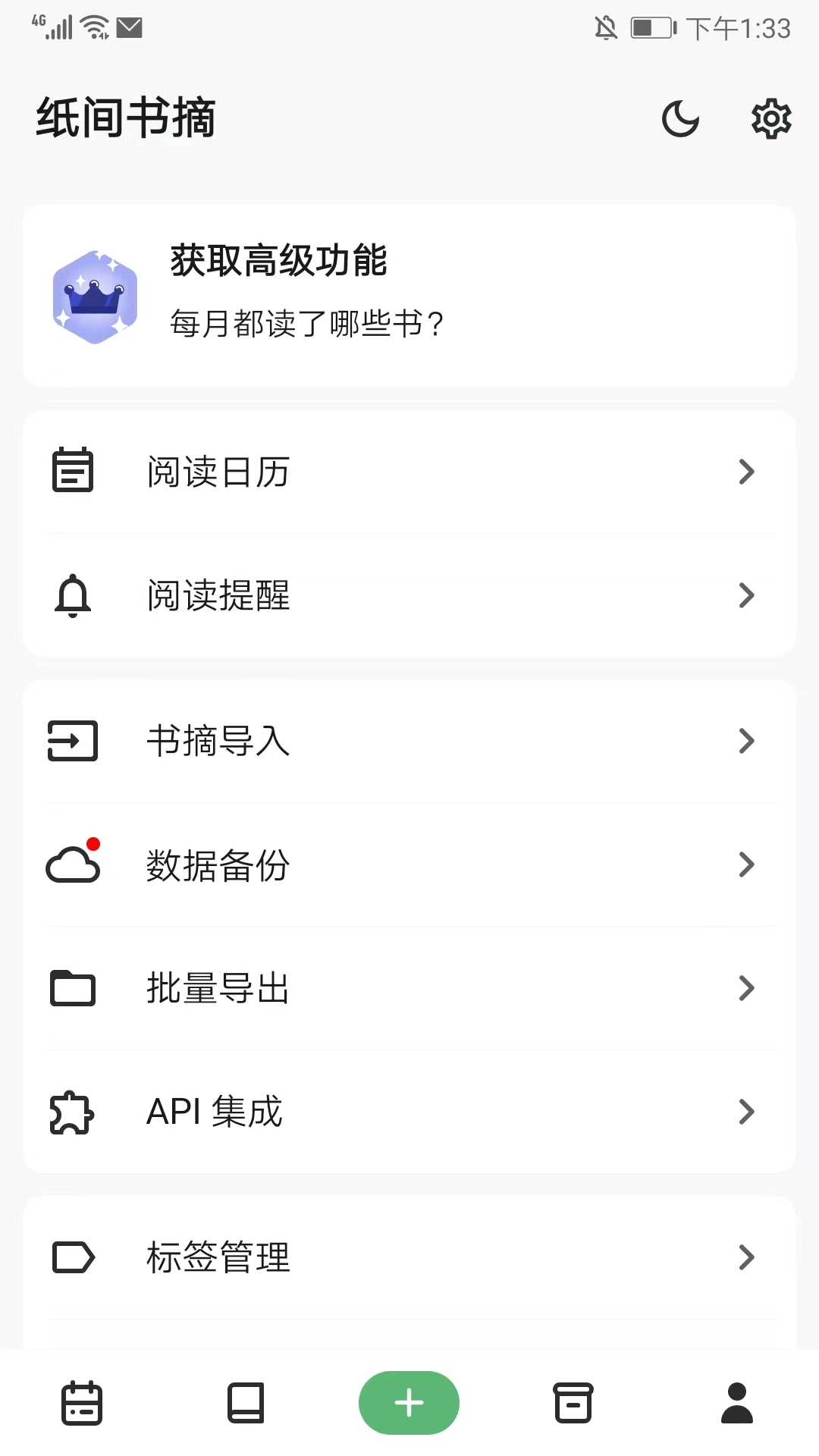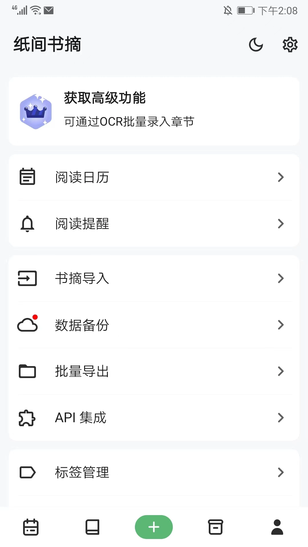 在用户中心界面,能够进行阅读日历、阅读提醒、书摘导入、数据备份以及批量导出等设置与功能的操作,以上便是纸间书摘的使用方法。