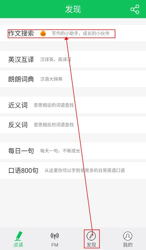 用户若想搜索作文,需先点击下方的“发现”按钮。接着,在页面上方找到并点击“作文搜索”选项,即可进入相应页面开始搜索。