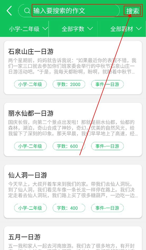 除了筛选作文外,用户还能点击上方的搜索框,输入想搜索的作文名称,再点击右上角的搜索按钮就行。