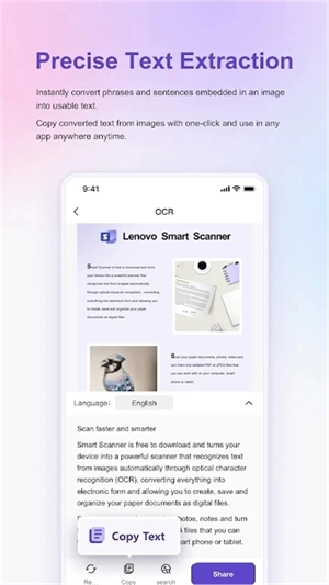 联想扫描王是一款功能强大且实用的智能扫描与文字识别工具,专为提升办公效率而设计。它具备高清扫描能力,能自动识别文档边缘,进行智能裁剪和纠偏,可将纸质文件快速转化为清晰的电子文档。该软件搭载OCR文字识别技术,支持多语言识别与翻译,能精准提取图片或扫描件中的文字内容,并转换为可编辑的文本。此外,它支持PDF、JPG等多种格式导出,兼容手机、平板、电脑多端同步,方便用户随时随地管理、分享和存储重要文件,是实现无纸化办公的高效助手。