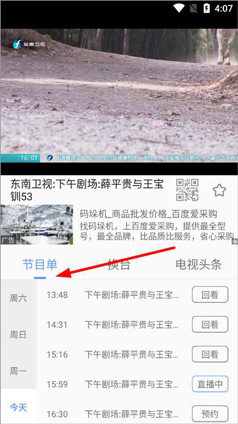 2. 向下拉动可查看正在热播的卫视,点击进入后,能够查看卫视节目单的详细信息以及相关剧集。