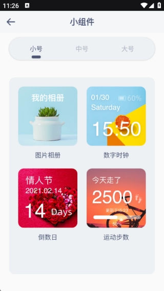 小组件包含小号、中号和大号等不同规格的组件,用户可根据自身需求灵活选择使用。