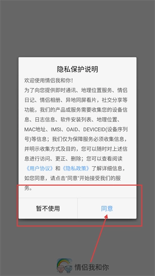 1、进入【情侣我和你】后,阅读【隐私保护说明】中的【用户协议】-【隐私政策】,点击【同意】按钮进入后续页面。