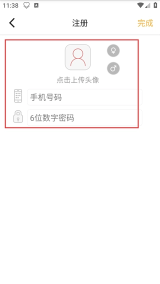 3、在注册页面,先完成【点击上传头像】操作,再填写【手机号码】-【6位数字密码】,准备提交注册信息。