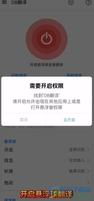 4、点击红色的开始按钮,就能打开悬浮窗的开启界面,之后点击“去开启”即可。