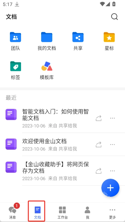 文档栏目支持新建文档,也可以查看我的文档、共享文档、星标文档、标签分类以及模板库等内容。