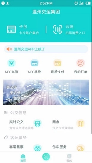温州交运是温州交运集团提供的手机客户端,这款软件可以让乘客通过刷脸的方式进入BRT车站,软件提供了卡包、云码、NFC充值、NFC补登、刷脸支付、实时公交、网点、客运售票、包车服务等功能,可以大大提高市民出行的便利性。